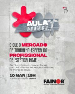 A FAINOR realiza, no dia 10 de março, a Aula Magna 2026.1 do curso de Estética e Cosmética, com o tema “O que o mercado de trabalho espera do profissional de Estética hoje”. O evento acontece a partir das 16h, no auditório principal, e marca o início do semestre letivo para os alunos do curso.