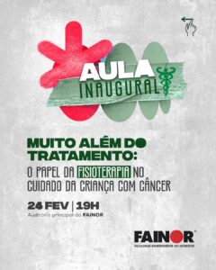 A atuação do fisioterapeuta no cuidado de crianças com câncer será o foco da Aula Magna, que acontece no dia 24 de fevereiro, às 19h, no auditório principal da FAINOR. Com o tema “Muito além do tratamento: o papel da fisioterapia no cuidado da criança com câncer”, o encontro propõe uma reflexão ampliada sobre a prática profissional diante de um dos maiores desafios da saúde infantil.
